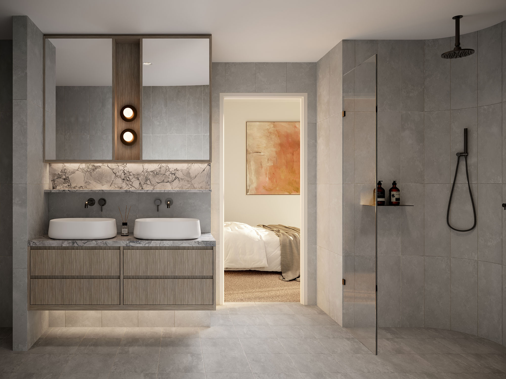 Every organic forms in the kitchen island are complemented by concave panelling and material layering to create an elevated experience. Generous separate laundries ensure ample storage, while integrated appliances provide modern convenience.